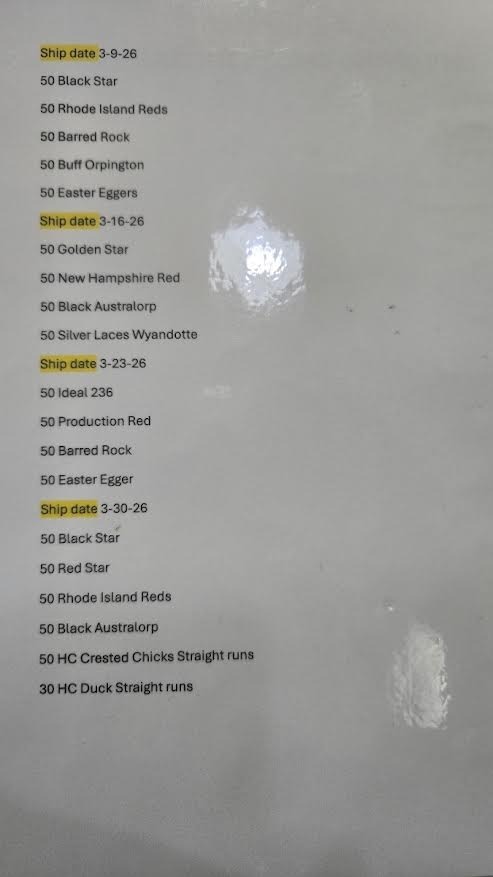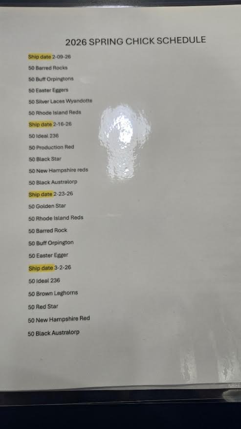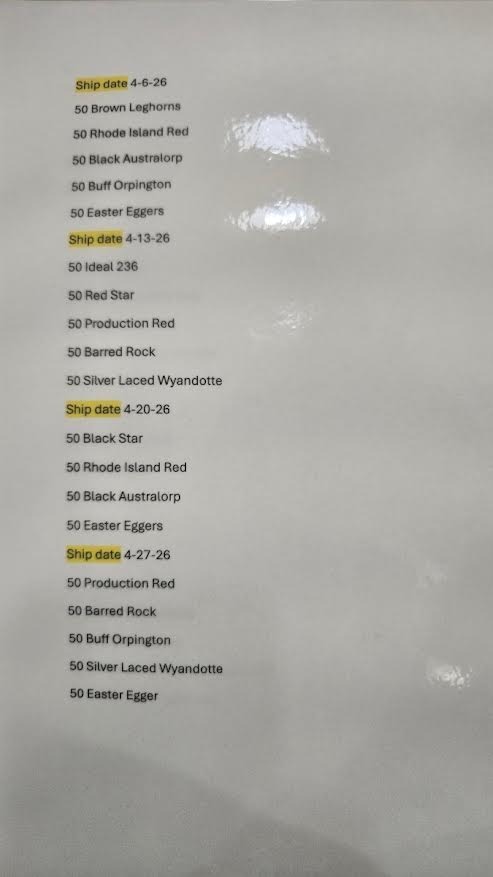 The dates shown reflect the ship dates, so chicks will be available for sale the following day.